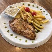 بشقاب مرغ گریل و سیب زمینی تنوری390سینه مرغ گریل شده همراه سیب زمینی تنوری ، سس قارچ و سس پستو